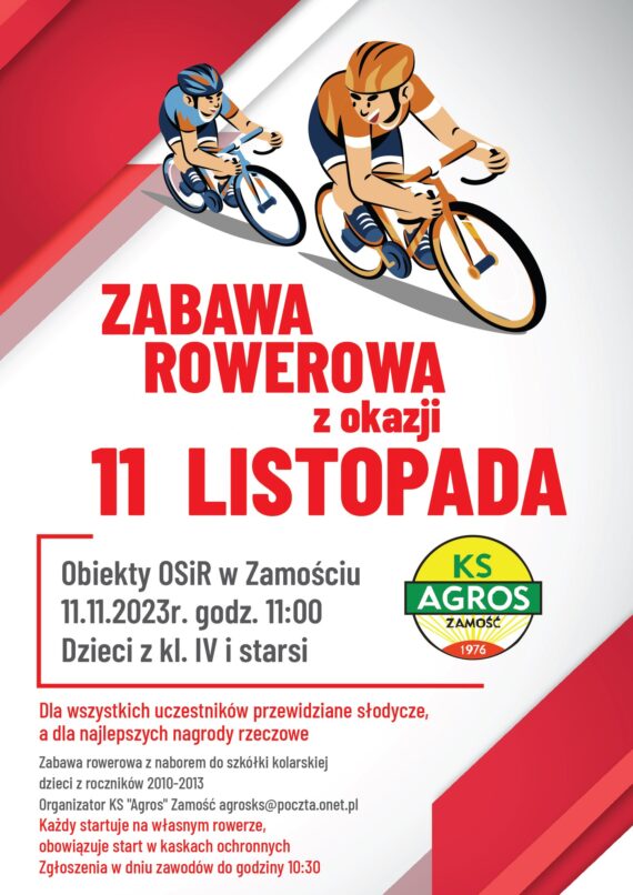 W dniu 11.11.2023 r. na obiektach Ośrodka Sportu i Rekreacji w Zamościu odbędzie się Zabawa Rowerowa z okazji 11 listopada. Serdecznie zapraszamy na zawody w kolarstwie przełajowym! Szczegóły na plakacie: Podziel się …FacebookTwitterPinterestLinkedinPrintEmail